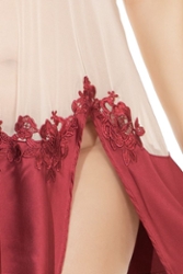 The latter are adorned with sumptuous merlot-red embroidery that contrasts delightfully with the nude of the original fabric. A band of satin-finish, elastic merlot fabric further supports your bust and marks the top of your waist, visibly refining the silhouette.