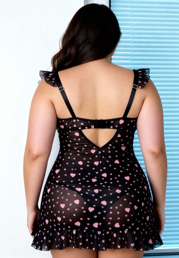 Une nuisette en tulle noir imprimé de petits cœurs roses, avec des volants au décolleté et à l’ourlet pour une touche très féminine. Les petits nœuds apportent un détail craquant, et la coupe légère laisse deviner juste ce qu’il faut.