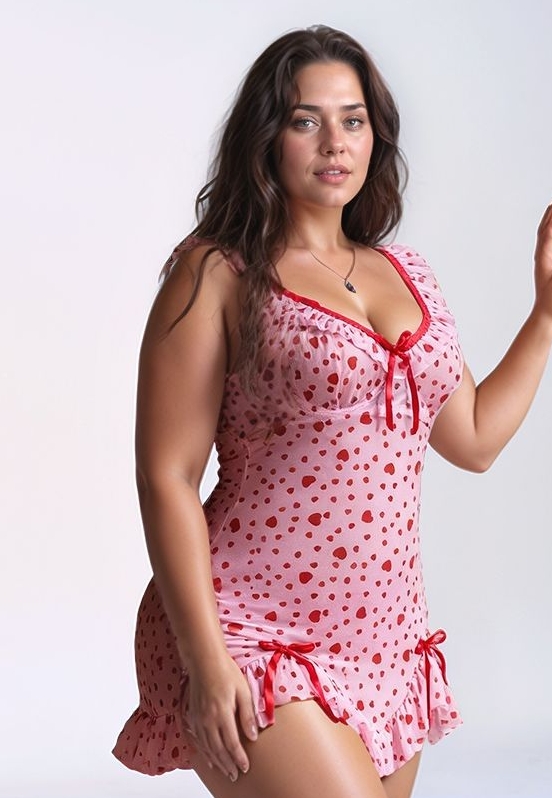 Une nuisette rose imprimée de cœurs rouges, avec des volants au décolleté et à l’ourlet pour une touche très féminine. Les petits nœuds (devant et sur les côtés) ajoutent un détail craquant, et la matière légère épouse les courbes tout en restant agréable à porter.